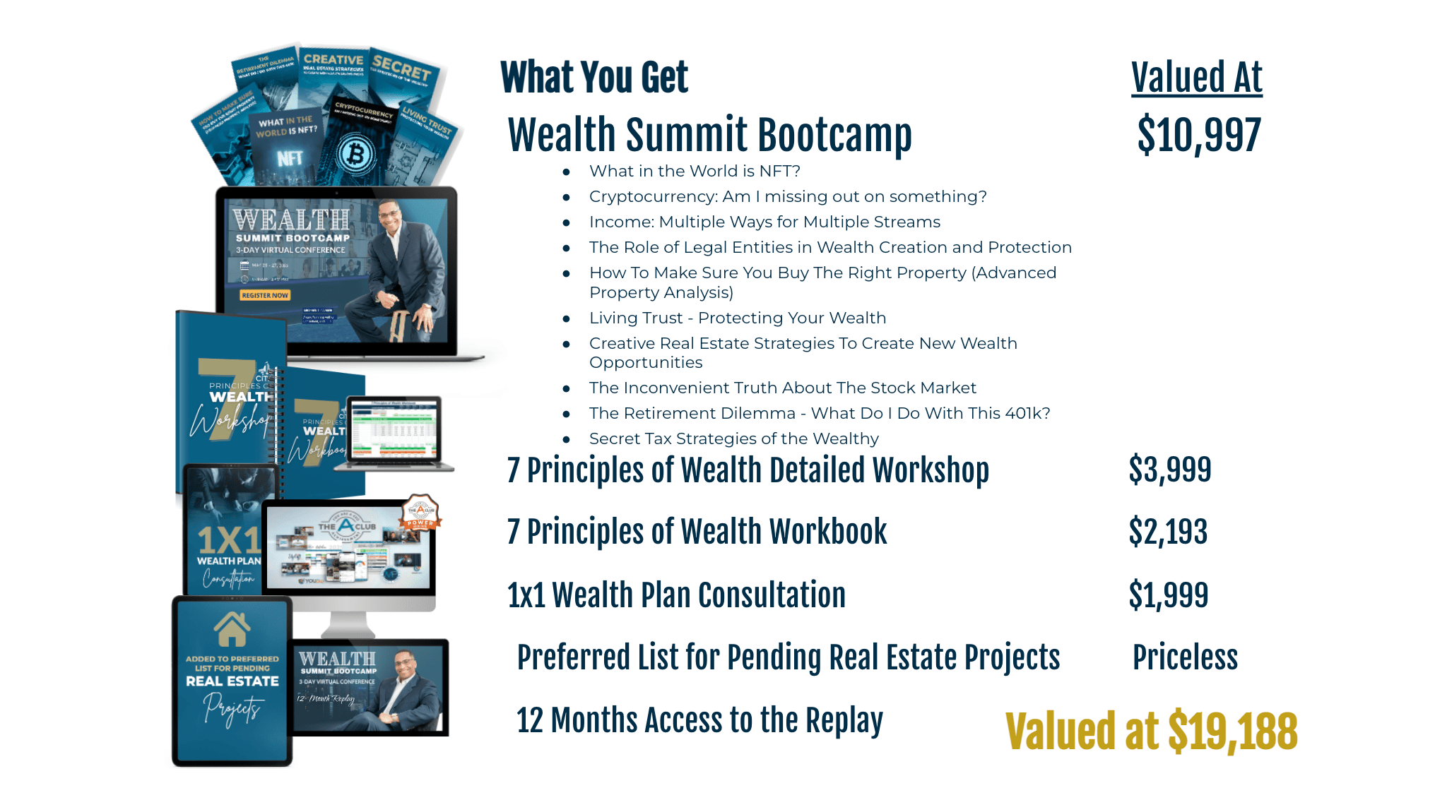 The Wealth Summit Bootcamp is your chance to learn from the world's top wealth experts and take your financial future into your own hands. You'll come away from the bootcamp with a comprehensive understanding of how to leverage some of the best wealth-building tools and techniques to create multiple streams of income.