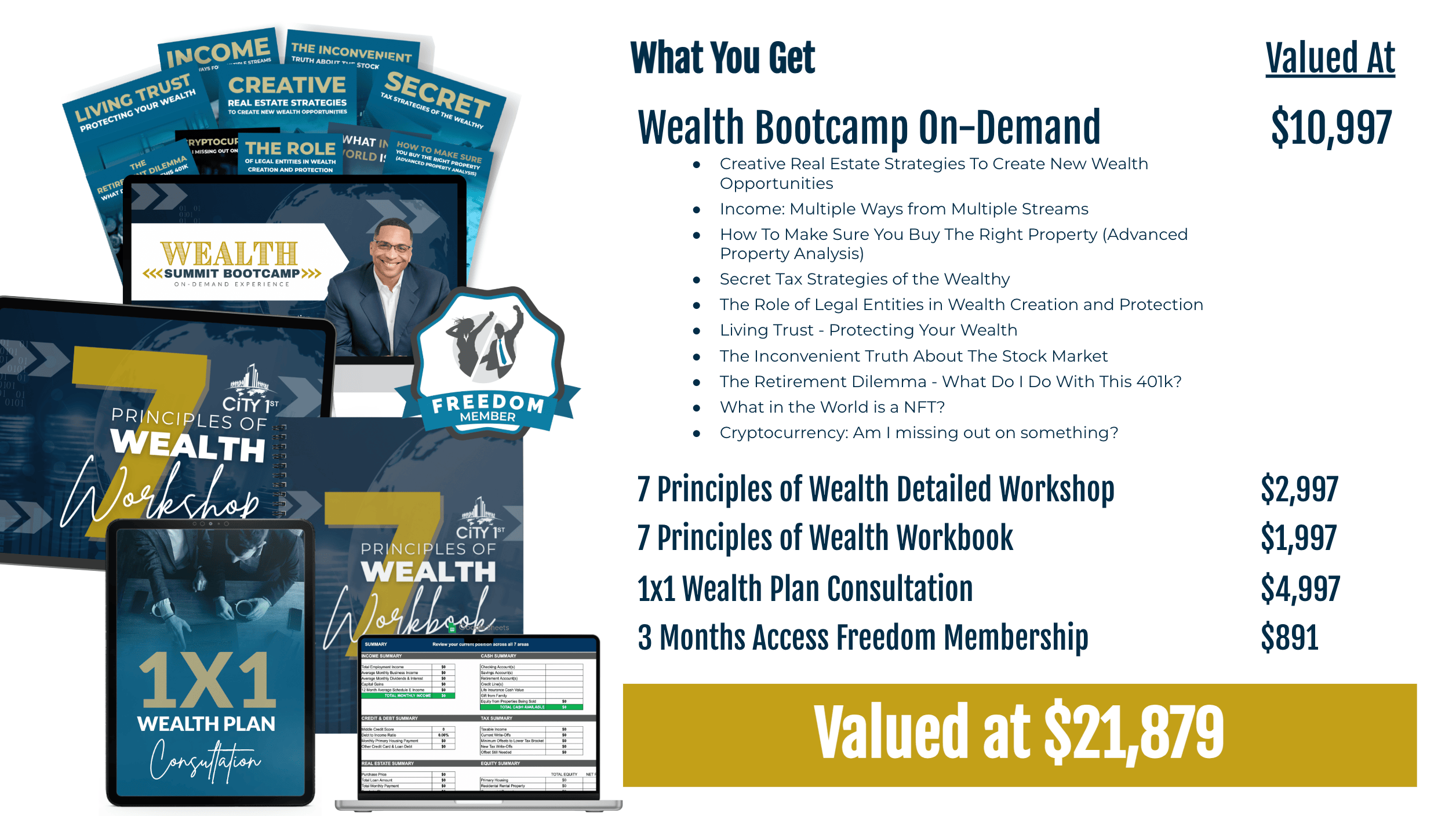 The Wealth Summit Bootcamp is a power-packed on-demand experience that will show you how to view your financial picture through new eyes and give you the tools to manage your way to a wealthy future you can leverage for generations to come.